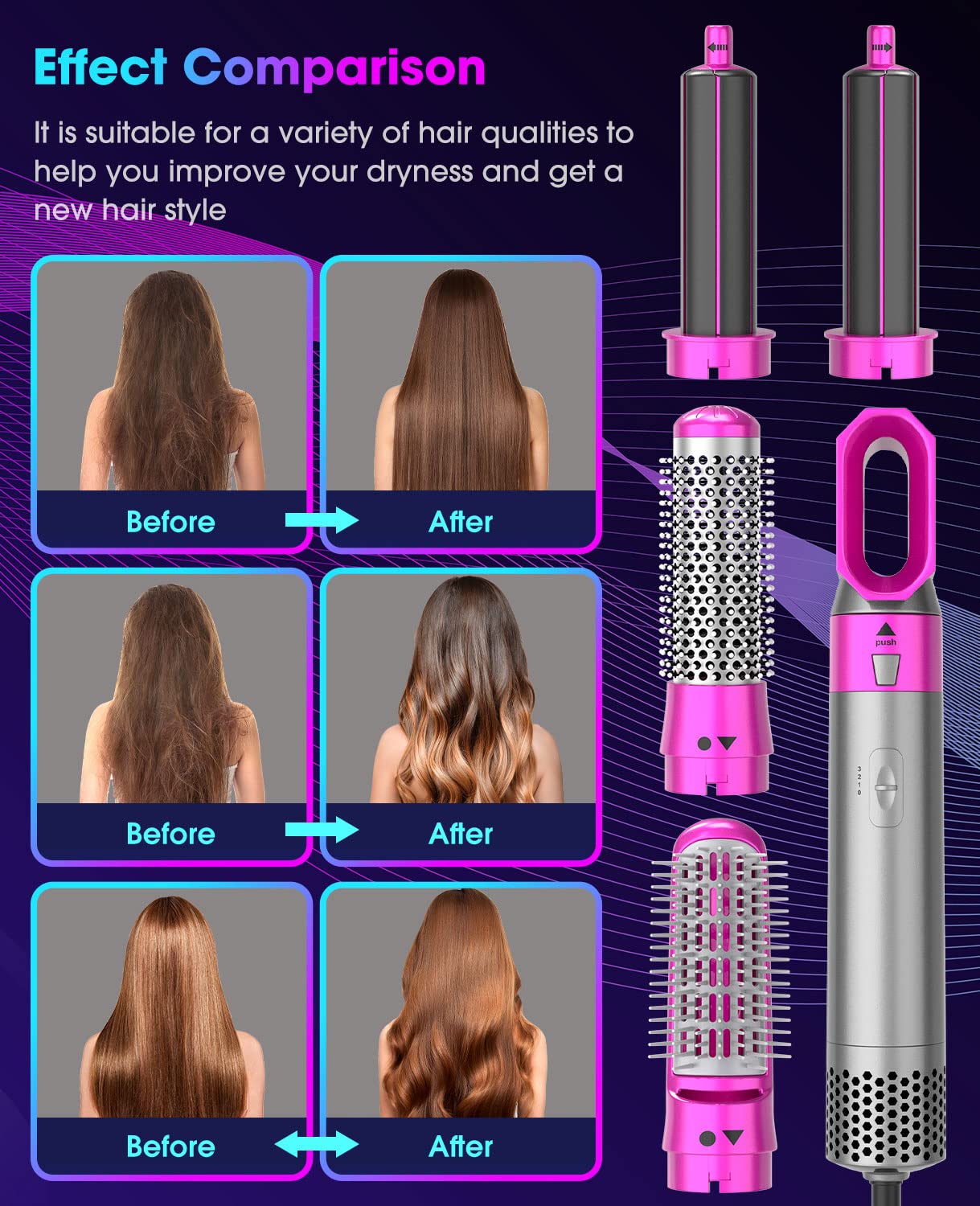 5 In 1Hot Hair Straightener Brush: Hot Hair Straightener Brush is multi-functional, it can not only straighten your hair but also use it to curl your hair, you only need to take it with you when you travel to meet any of your hair styling needs.